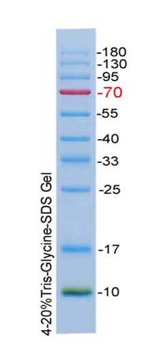 本產(chǎn)品包含10種純化的預(yù)染蛋白質(zhì)組成,分子量范圍為10-180kD,其中70kD條帶為紅色,10kD條帶為綠色,其余條帶為藍(lán)色,可以用于SDS-PAGE和Western Blot轉(zhuǎn)膜時(shí)確定未知蛋白的分子量。